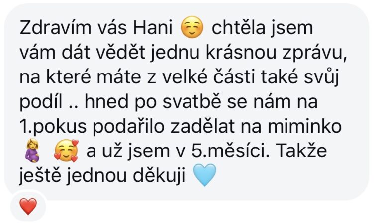Ve spolupráci jsem necelé 3 měsíce a za tu dobu jsem shodila 3 kila, nejsem tak nafouknutá a mám více energie. Jelikož trpím endometriózou, zařadila jsem na doporučení Hanky protizánětlivou stravu (bez lepku a kravských produktu), doufám, že i její projevy se budou časem zmírňovat, prozatím je to krátká doba, ale i tak pociťuji nějaké zlepšení.